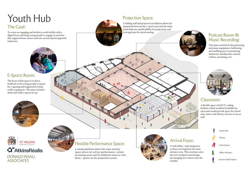 This extension will provide for a new fully accessible entrance in line with the Equality Act and positively interface with the new St Helens Transport Interchange, providing a welcoming entrance linking directly to the newly created Gamble Plaza and the wider Phase 1 town centre regeneration area.
